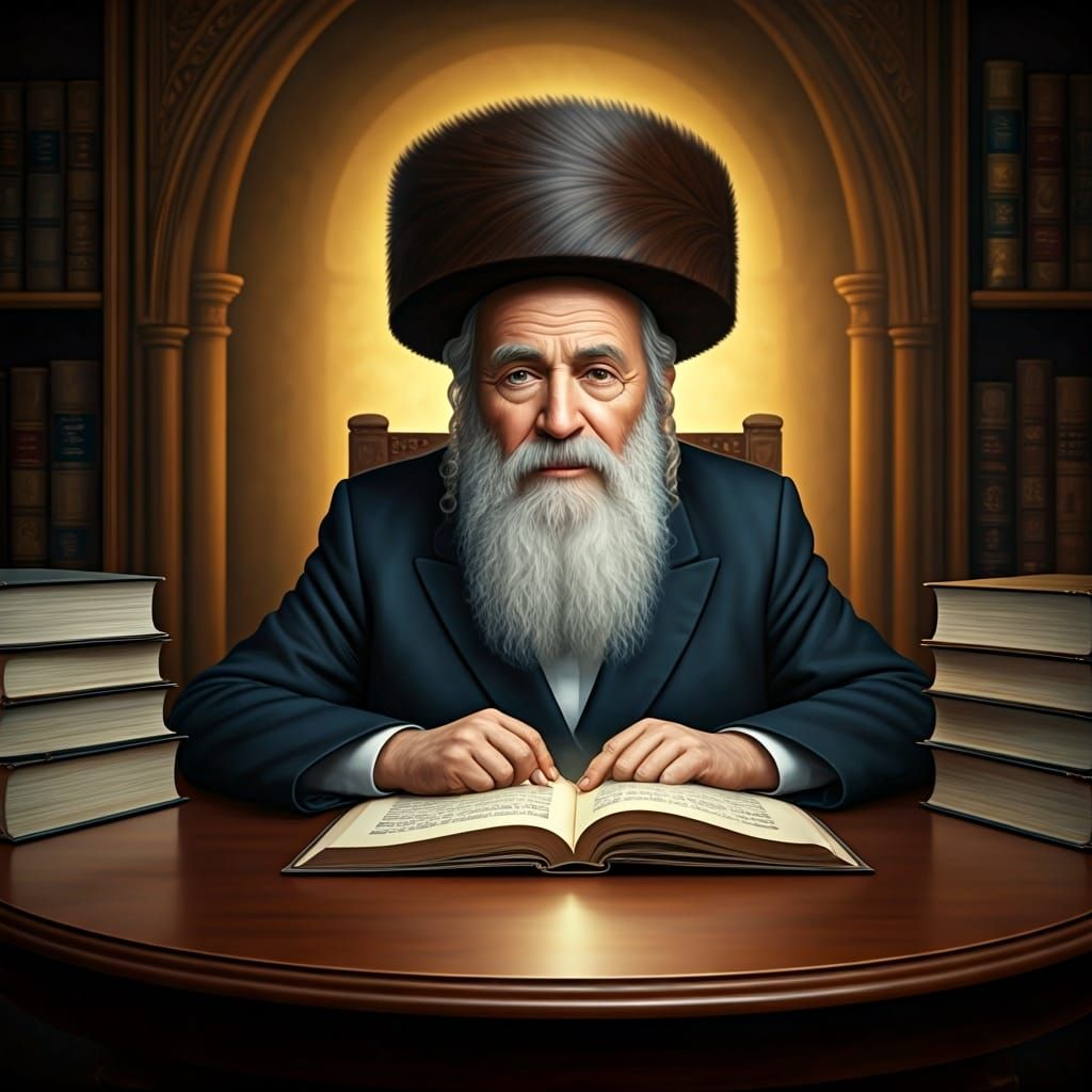 A portrait of a wise, elderly Hasidic Jew seated at a table amidst holy books. The image features dramatic lighting and rich colors in a gothic art style.