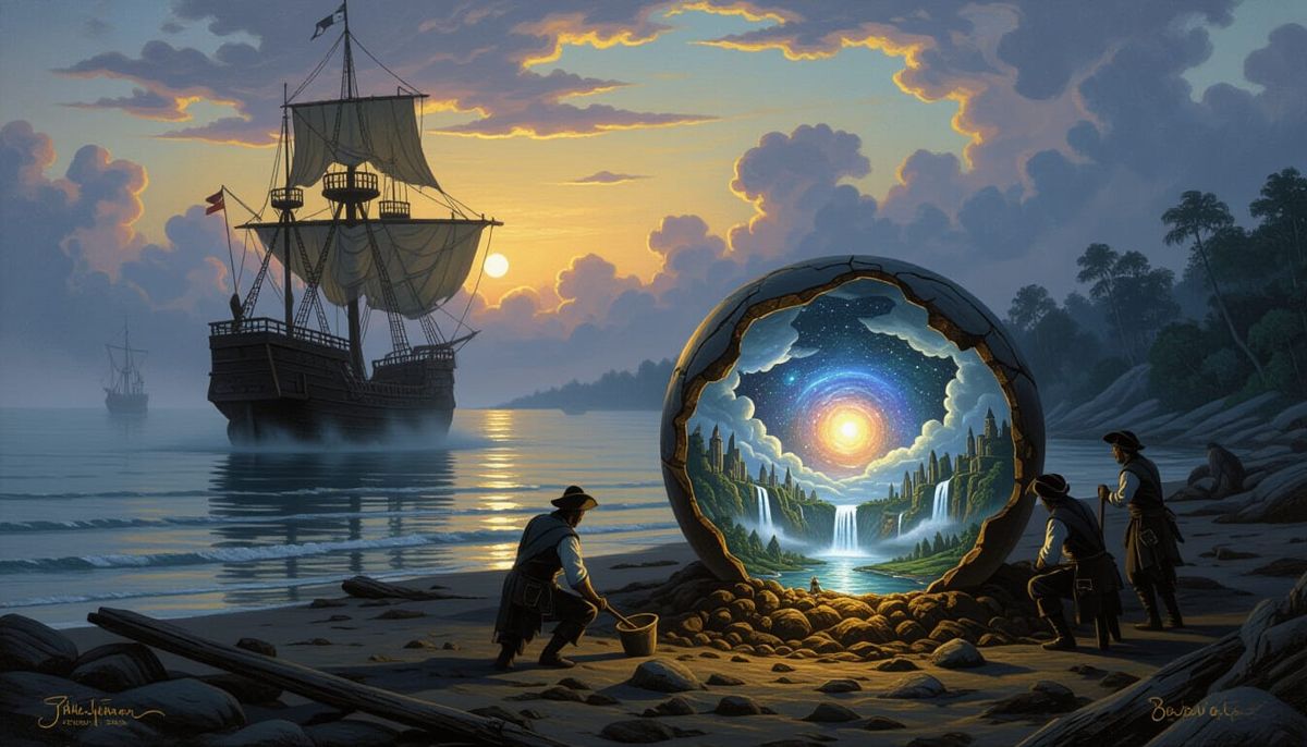 An oil painting showing pirates discovering a glowing cosmic orb on a twilight beach. The orb contains a miniature world with ethereal beings, illuminated by golden and sapphire light in a surreal atmosphere.