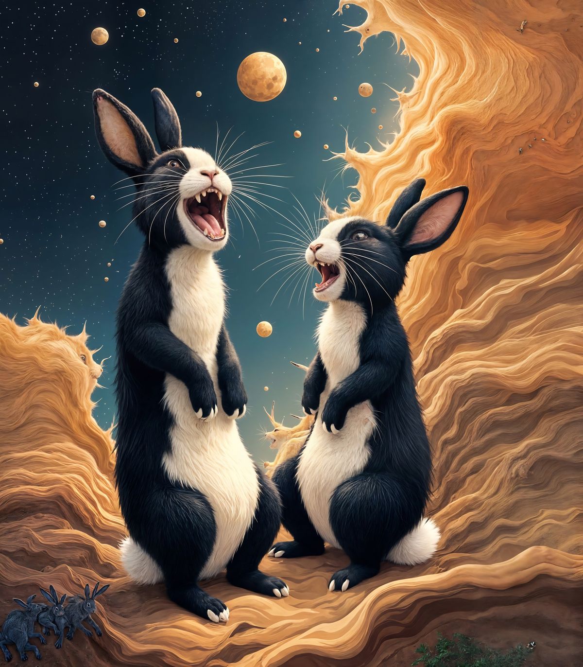3 black and white rabbits two of them are rolling around on their backs on the ground laughing hysterically and none wore suits or helmets h...