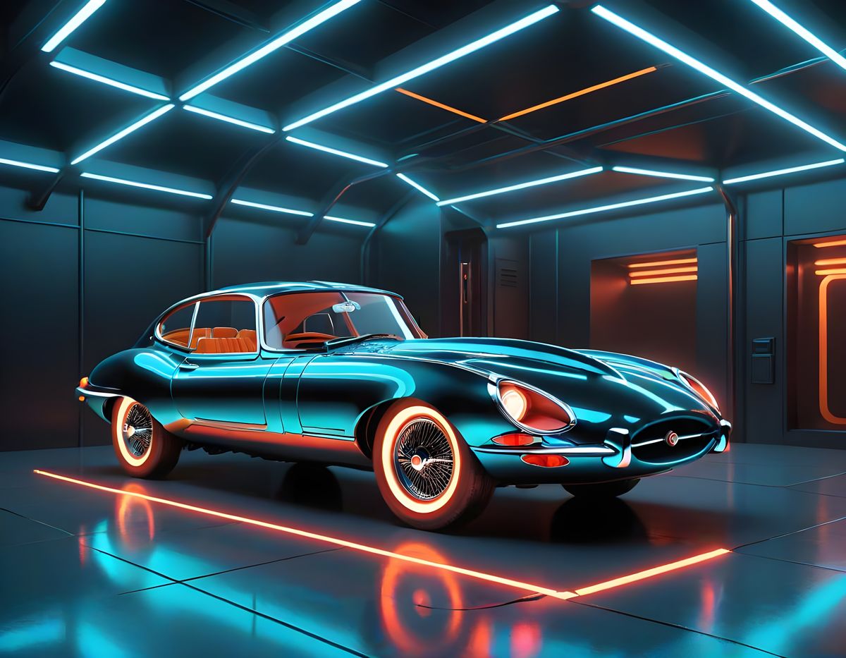 digital painting of a 1960s Jaguar E-Type with retro-futuristic upgrades: chrome-plated fins, glowing neon tube accents along the chassis, and a transparent canopy displaying holographic speed读outs. The car stands on a matte black platform with vintage sci-fi glyphs etched beneath it, surrounded by faint geometric light beams. retro-futurism style, hyper-detailed, vivid electric cyan and burnt orange hues, smooth gradient backgrounds, cyberpunk chrome reflections, metallic textures, 8K clarity.