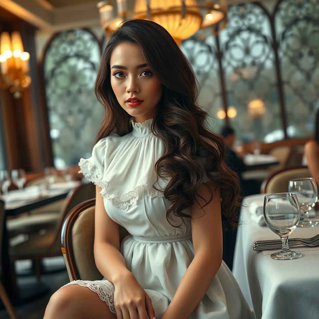 A close-up image of a woman in a white lace dress sitting at a table in an elegant restaurant. The scene evokes an Art Nouveau aesthetic with soft digital painting techniques and realistic portraiture.