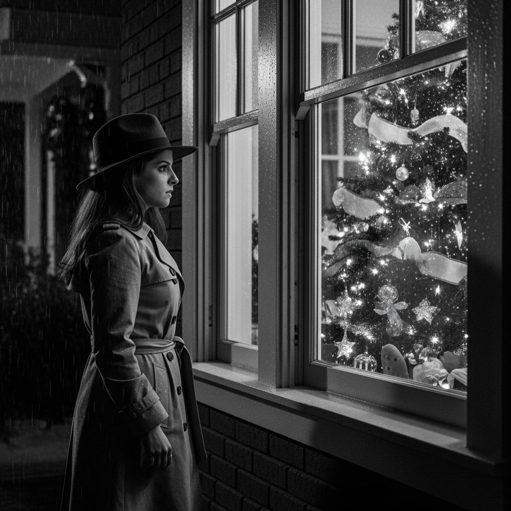 This cinematic image captures a rainy night in film noir style, featuring a woman in a trench coat gazing through a window at a festive Christmas tree inside. Shot like a 35mm film still, it's atmospheric and dramatic.