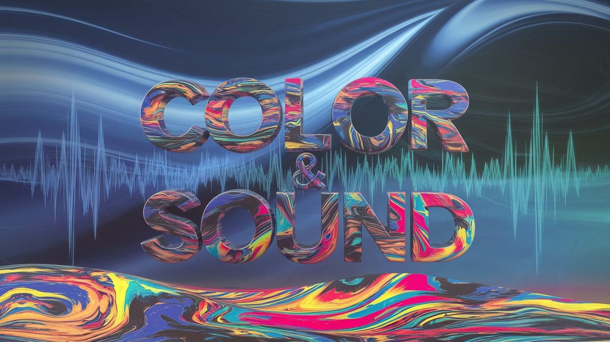 This image shows the words "COLOR & SOUND" integrated into a vibrant, paint-splattered landscape. Sound waves radiate outward, set against a dreamy background with ambient occlusion, rendered as 3D digital art.