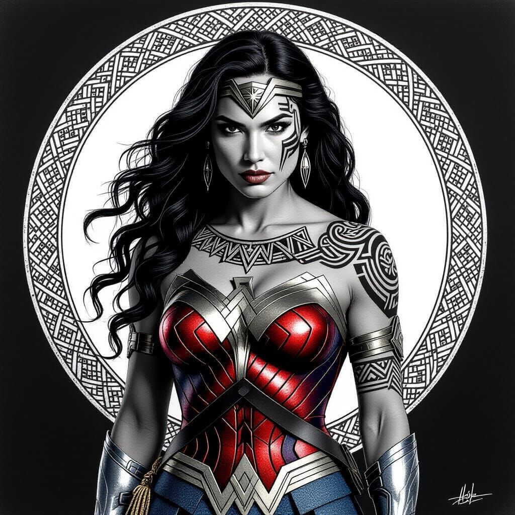 This hyperdetailed charcoal drawing features a powerfully posed Wonder Woman adorned with intricate Maori tribal patterns and symbolic designs, rendered with high contrast and dramatic lighting.