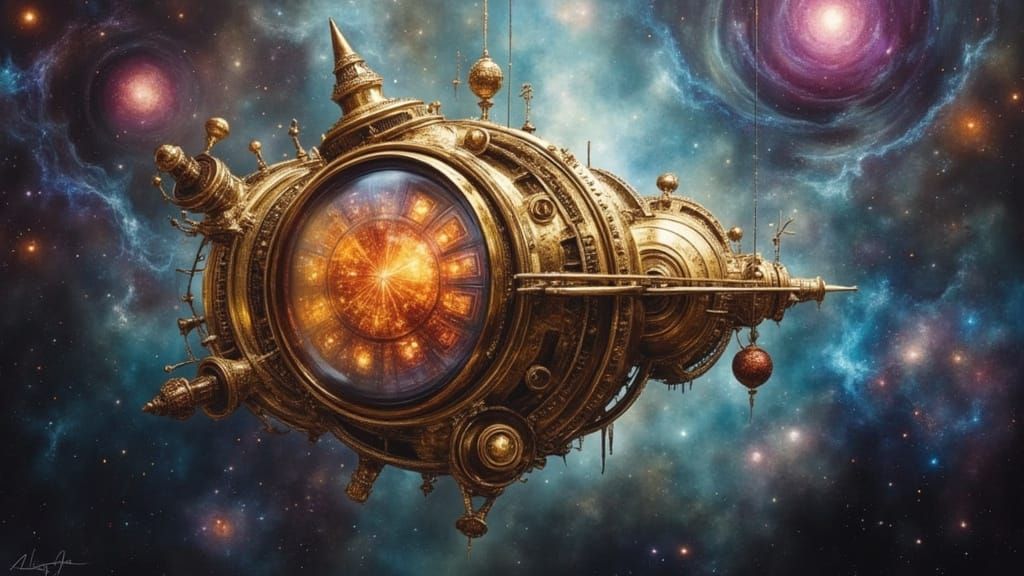 This surrealist oil painting depicts a complex, glowing mechanical tool with brass and steel parts, set against a vibrant, swirling cosmic backdrop. Features dramatic lighting and a dark fantasy aesthetic.
