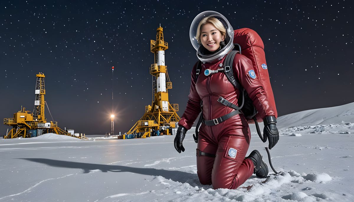 A realistic, full-body image of a smiling blonde Tibetan astronaut in a burgundy spacesuit, crouched by an oil drill on a frozen, nighttime alien surface under a galaxy.