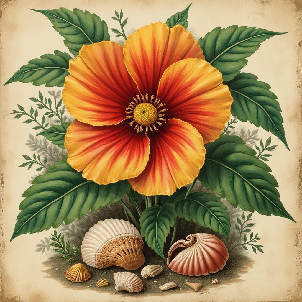 A botanical illustration in a vintage style. The image shows a delicate red and yellow flower surrounded by lush green foliage and shells, reminiscent of 19th-century natural history.