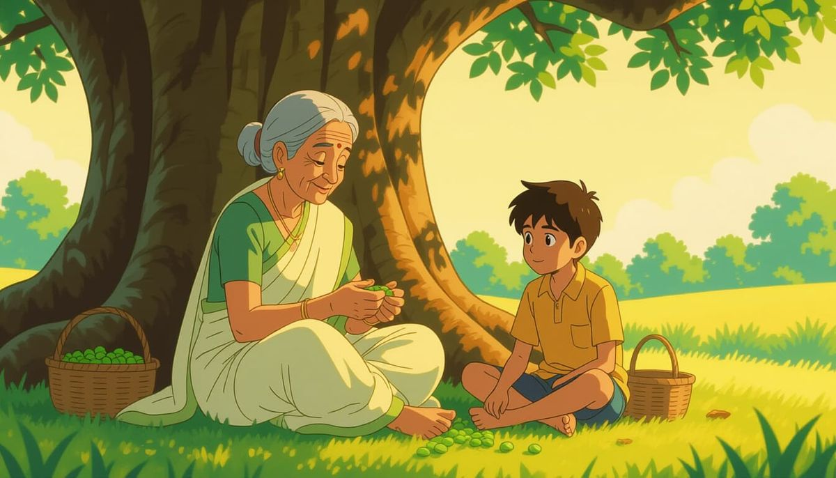 A heartwarming cartoon illustration of an elderly Indian woman and a teenage boy under a banyan tree. Features soft golden light and intricate details in anime key visual style.