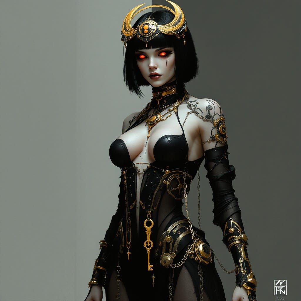 A striking image of a futuristic woman in a dynamic pose, adorned with intricate mechanical details and glowing red eyes, set against a muted gray background in a detailed, matte painting style.