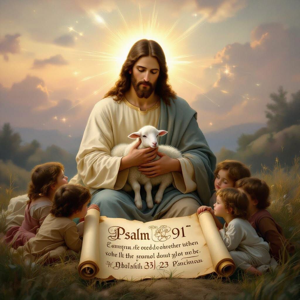 This digital painting shows Jesus as a protective shepherd holding a lamb, with children nearby. Features ornate calligraphy of Psalms 91 and 23. Evokes peace and divine protection in soft, pastel hues.