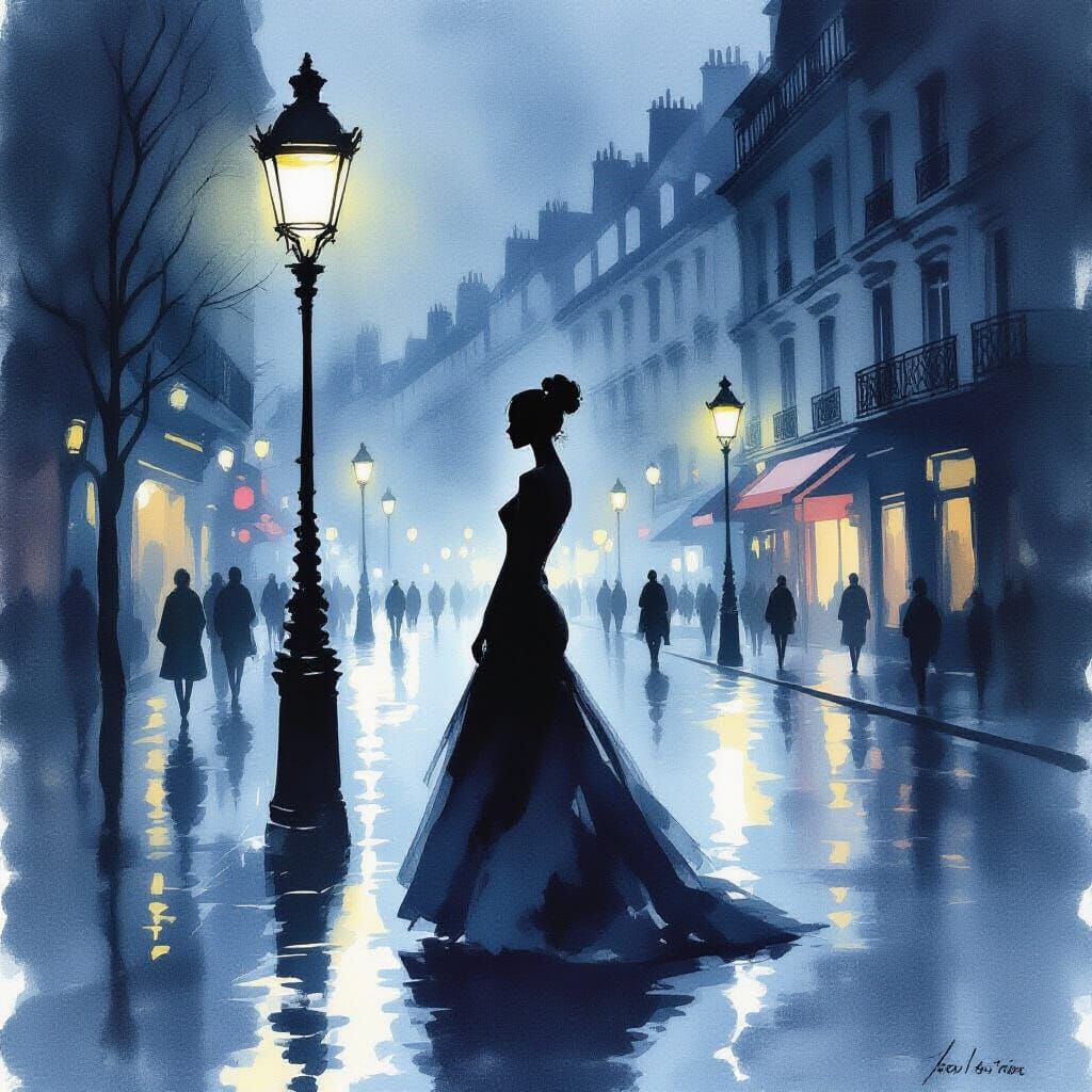This image shows a fashion model on a wet Parisian street at night, illuminated by a gas lamp. Rendered in a moody watercolor style with deep blues and greys, evoking melancholy.