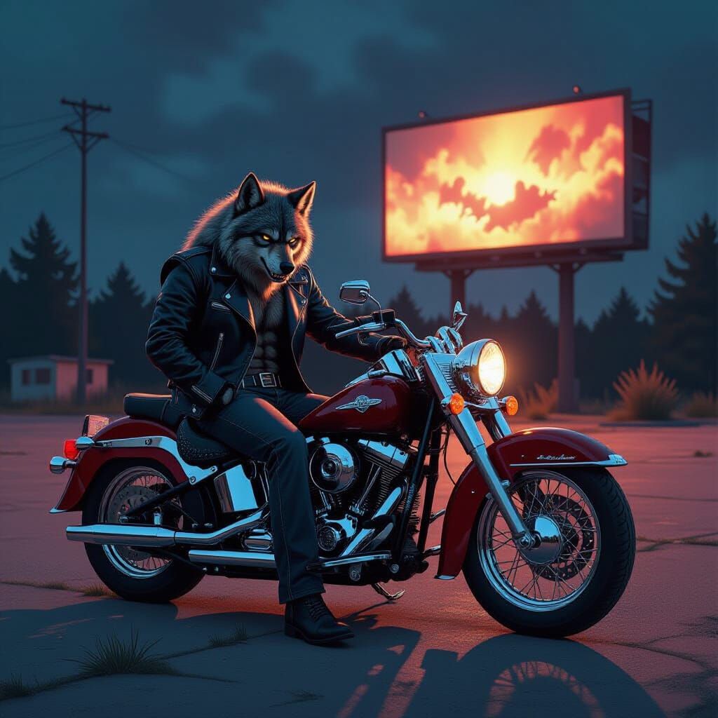 A striking picture of a werewolf greaser at a deserted drive-in. The scene is illuminated by the eerie light of the screen in an atmospheric, film noir style. The image is rendered as a hyperrealistic oil painting.