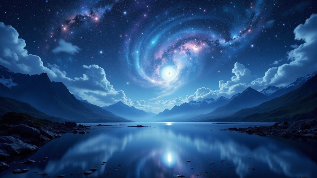 This image depicts a stunning moonlit mountain landscape under a vast, swirling starry sky, captured with a long exposure effect. It features a serene lake reflecting the cosmos, rendered in deep blues and purples with an ethereal glow.