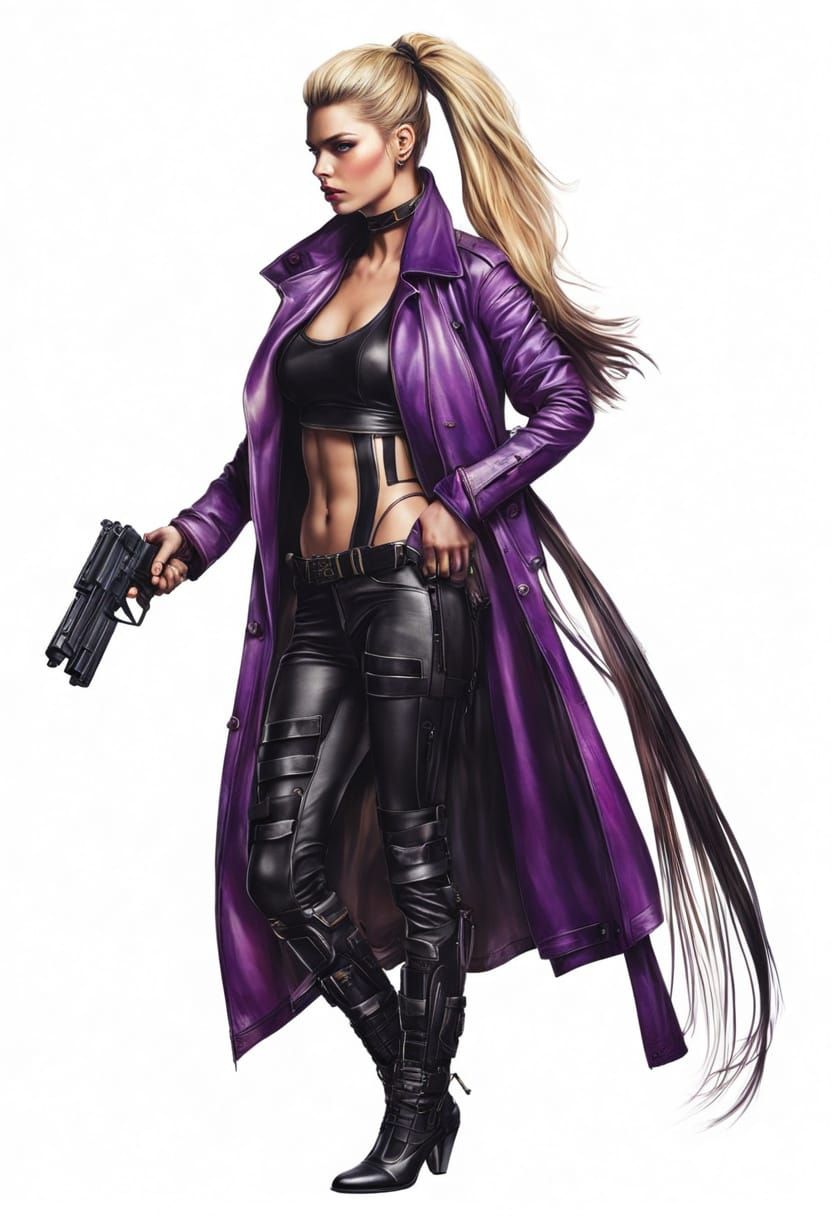 A digital portrait of a woman with long blonde hair in a ponytail, wearing futuristic black and gold attire and holding a pistol, set against a Cyberpunk New York backdrop.