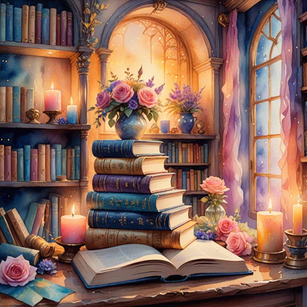 This enchanting watercolor illustration captures a romantic, mystical atmosphere with a bookshelf overflowing with mystical and magical books, love candles, and bohemian trinkets. Soft, blended brushstrokes and pastel colors of blue, pink, rose, and purple create a dreamy, ethereal quality.