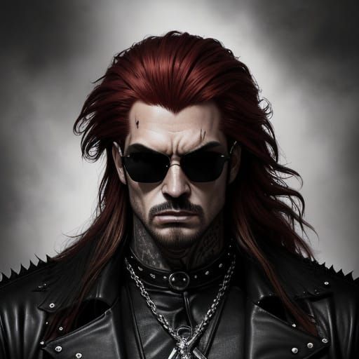 This image depicts a demonic male wrestler with striking features, posing in a dimly lit arena. The artwork combines dark, muted colors with bold highlights, evoking a heavy metal aesthetic reminiscent of comic book art.