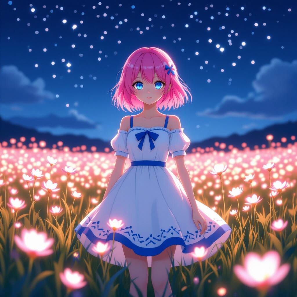 This image showcases an anime girl with pink hair in a white dress amidst glowing flowers under a starry sky. It features cel-shaded art and dramatic lighting, reminiscent of dynamic animation studios.