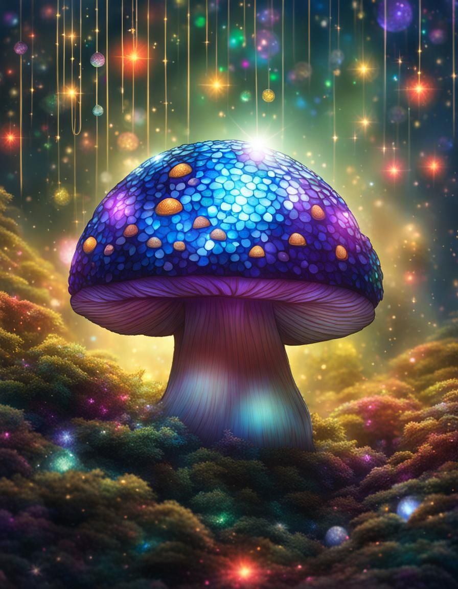 A whimsical image of an anthropomorphic mushroom hiding beneath a glittering disco ball. The scene is surreal and playful, contrasting natural and artificial elements.