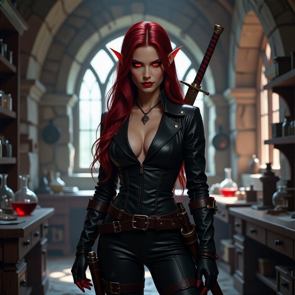 This image shows a tiefling alchemist with striking red eyes and hair in a medieval laboratory. The character is wearing a dark leather suit and katana, rendered with dynamic lighting in a dark fantasy aesthetic.