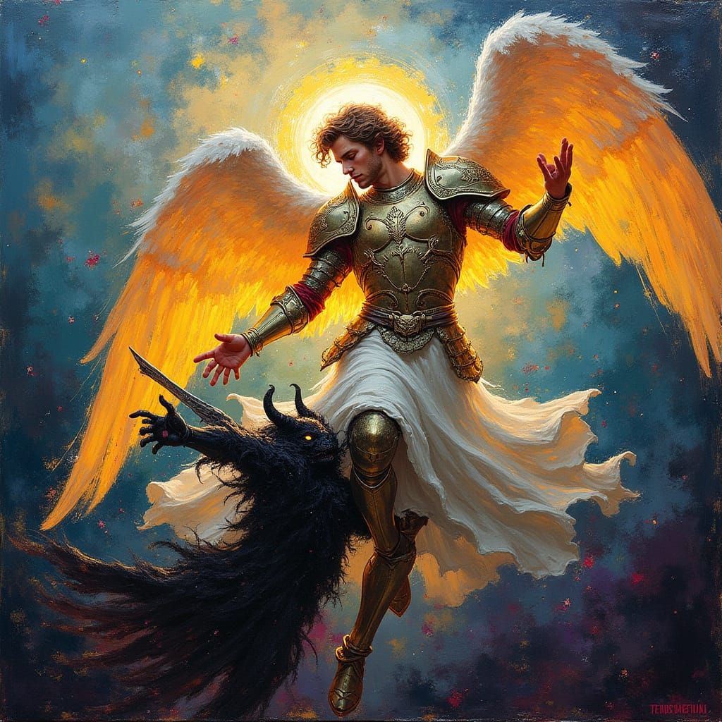 Arch angel Micheal, glowing wings, slaying a demon, neo-impressionism expressionist style oil painting, smooth post-impressionist impasto