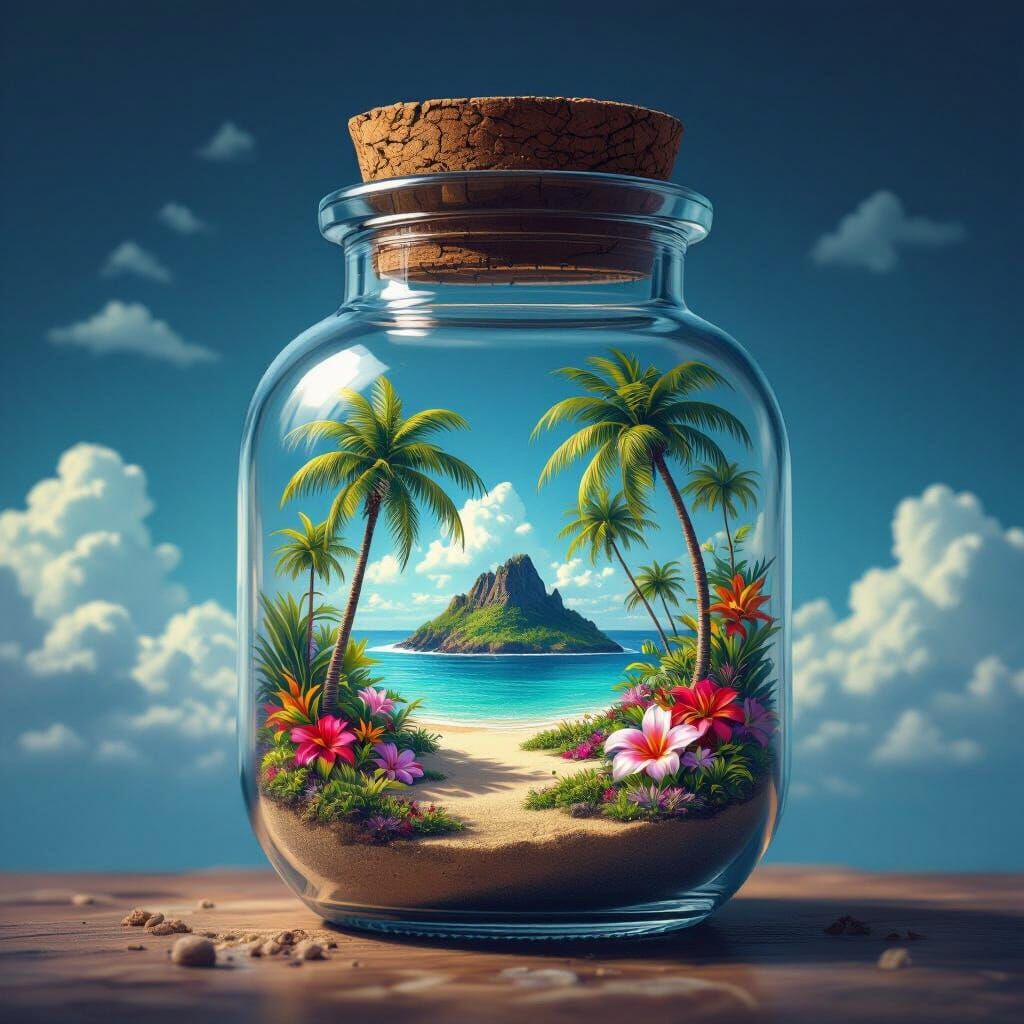 A striking picture of a miniature Hawaiian island inside a glass jar. The landscape features palm trees and flowers set against a dramatic blue sky as futuristic digital art.