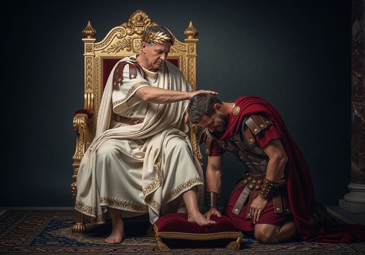 This image shows a Roman Emperor sitting on a golden throne. A soldier kneels at his feet in humiliation. The scene is captured in sharp focus with natural lighting, resembling professional photography.