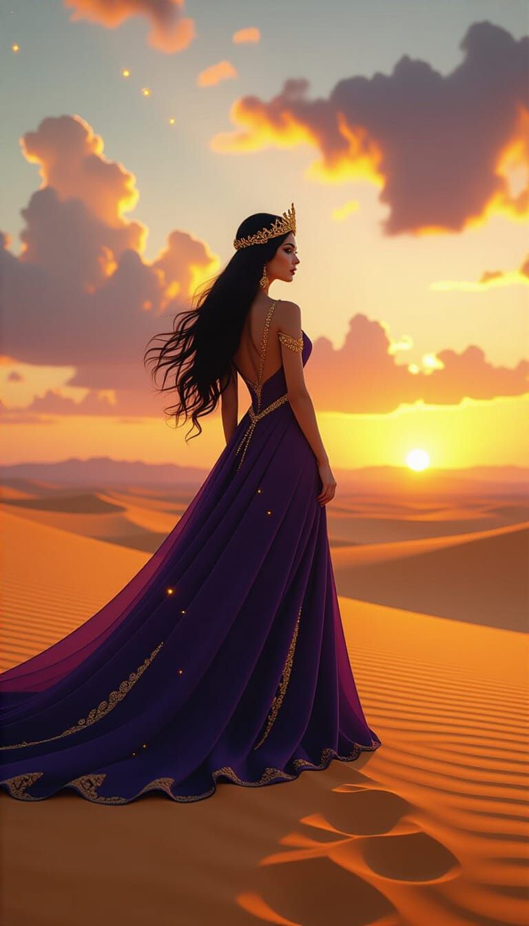 This image showcases a beautiful woman in a deep purple gown with gold accents, standing in a glowing desert at sunset. Features dramatic clouds and ethereal particles, rendered with ultra-realistic detail.