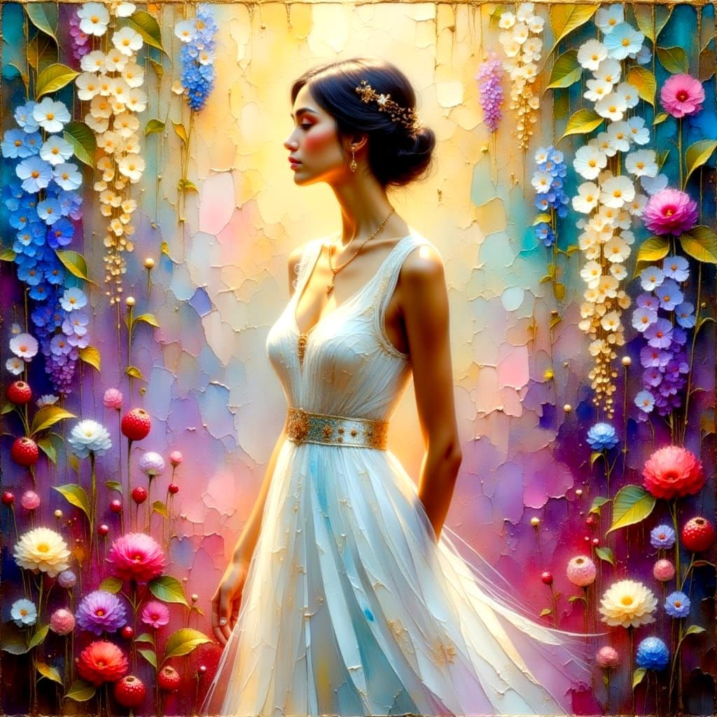 This image shows a beautiful woman surrounded by peaceful elements, including raspberries, wisteria, and bubbles, in a dreamy, textured oil painting style with metallic and earthy tones.