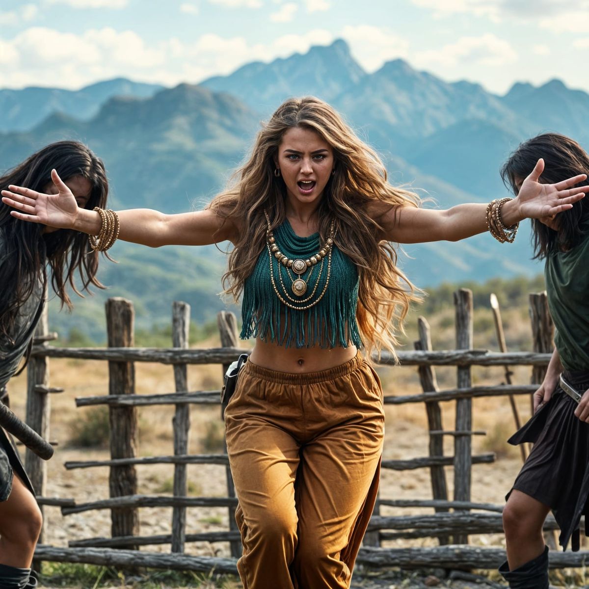 This image shows a furious woman with flowing golden brown hair and amber eyes. She wears a teal beaded top and suede pants and stands in front of an Ancient Greek landscape. The image is a cinematic still.
