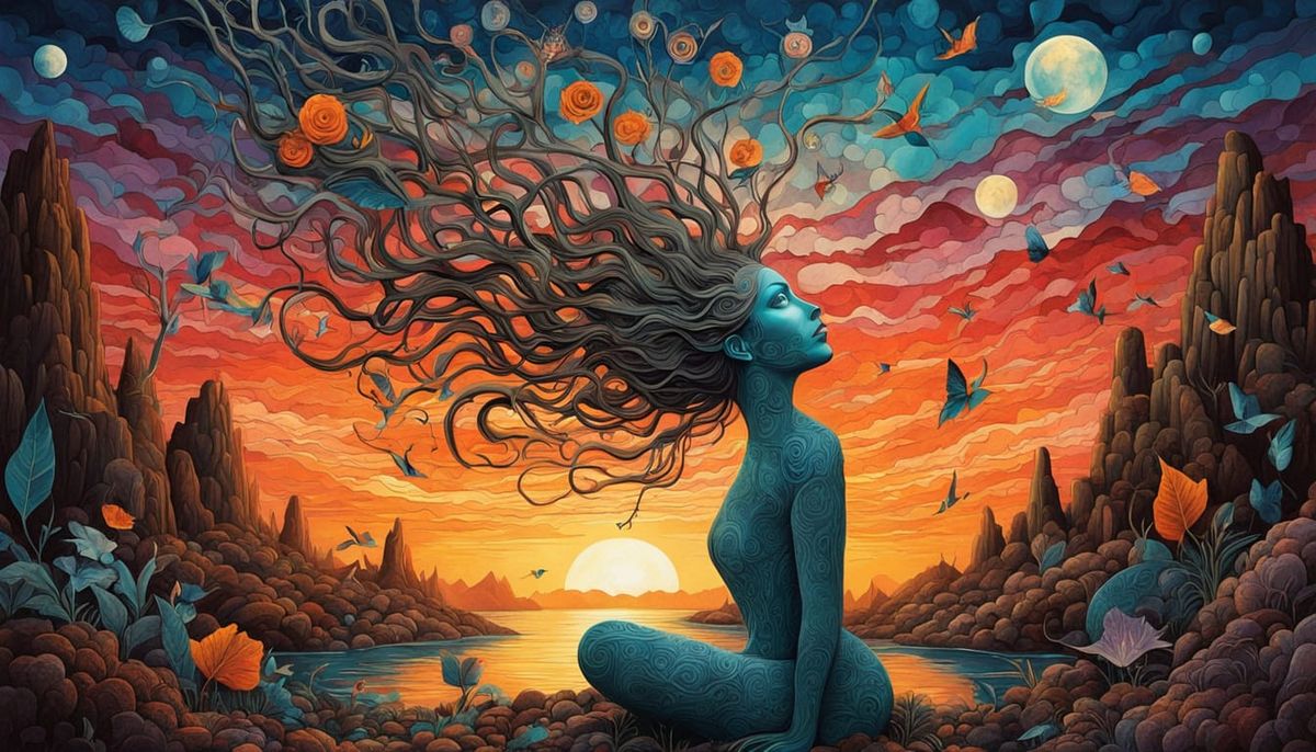 This enchanting image captures a mystical shaman amidst a vibrant, music-filled labyrinth at sunset, surrounded by glowing creatures and shattered mirrors. With intricate bioluminescent details and a sense of surreal wonder, the scene is a testament to the fusion of Expressionism and Surrealism.
