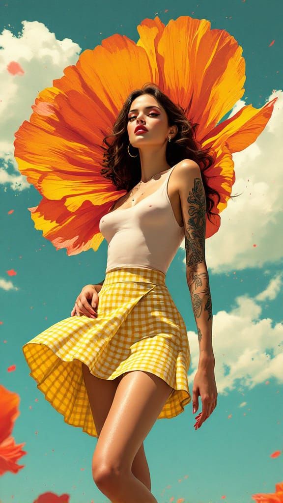 This image features a woman in a bold, elegant pose, holding a massive poppy. It blends vintage poster illustration with Art Deco geometry and grunge textures, using high contrast and warm-to-cool color transitions.