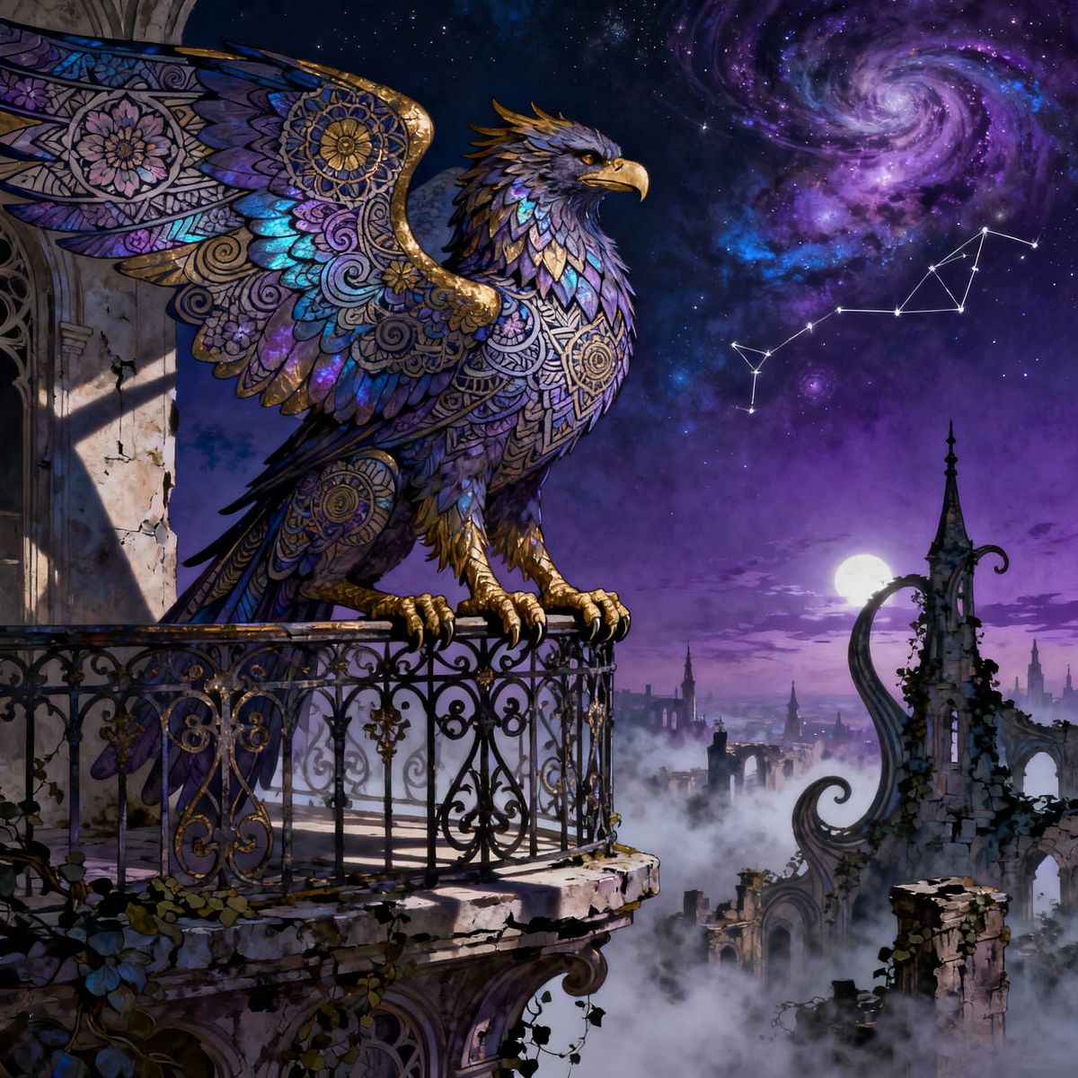 This image shows a majestic griffin with intricate Zentangle feather patterns on an Art Nouveau balcony at twilight. An ancient city and nebulae fill the dark sky, illuminated by ethereal moonlight.