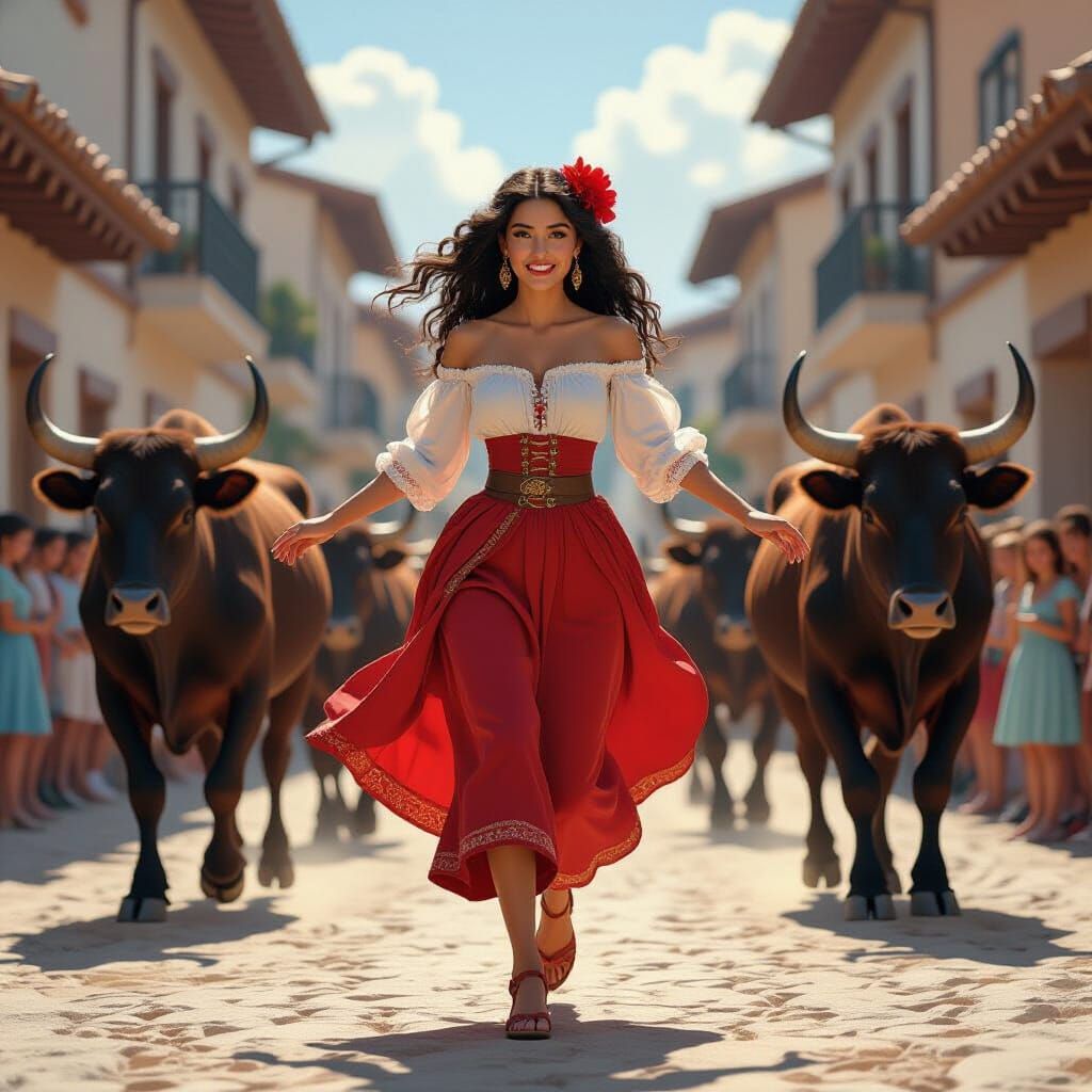 This image shows a woman in traditional clothing running ahead of bulls through the barricaded streets. Dynamic lighting and hyperdetailed rendering create a vivid scene in a triadic color scheme.