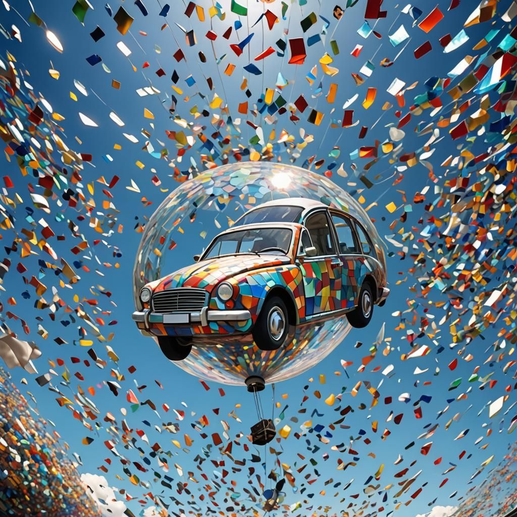 A surreal image of a cubist mosaic car floating in a glass balloon against a blue sky. The artwork features a bold, fantastical color scheme as a detailed matte painting.