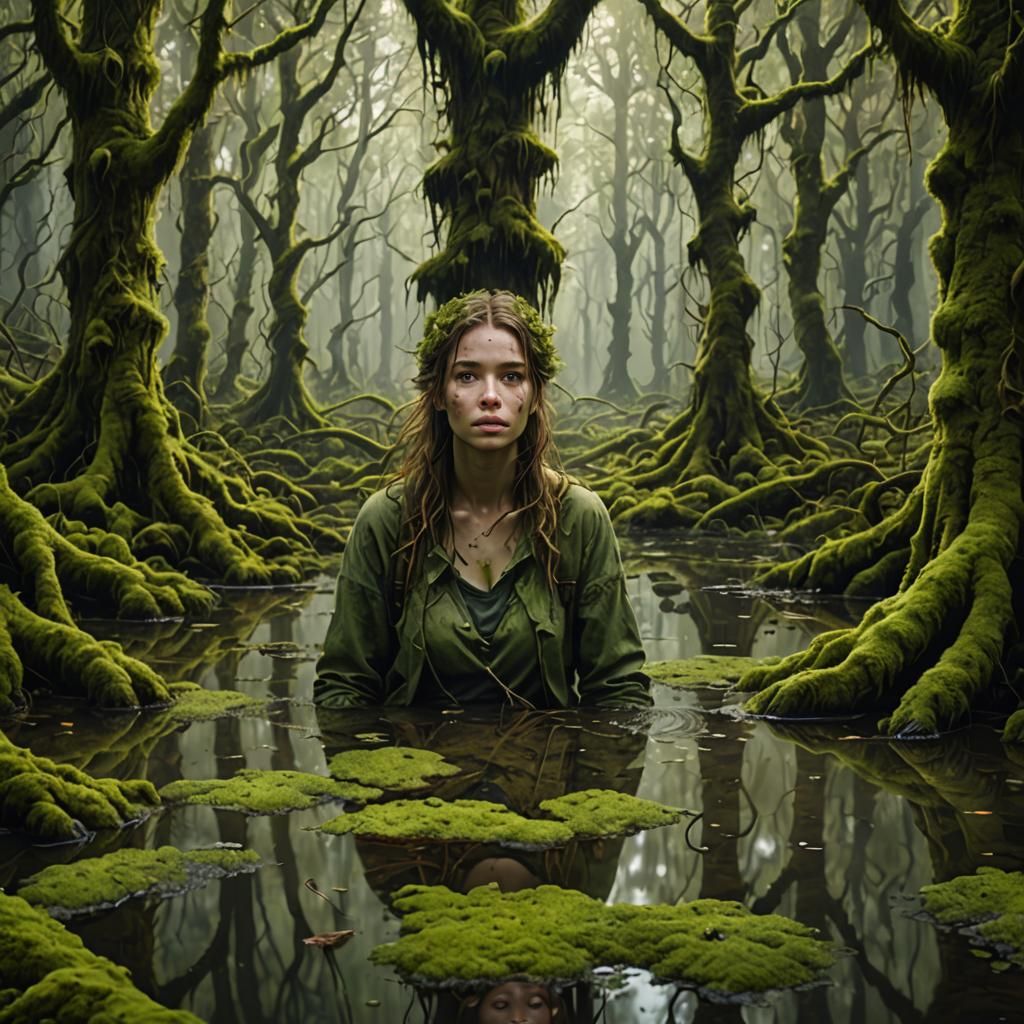 This image shows a beautiful woman emerging from a swamp in a primeval forest. Hanging moss adds to the ultrarealistic and mysterious atmosphere.