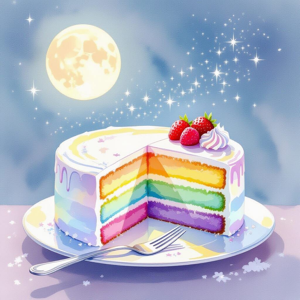A dreamy watercolor fantasy illustration of a magical rainbow cake. Its glowing slices leave trails of stardust in pastel-colored air, painted with soft textures and a whimsical storybook charm.