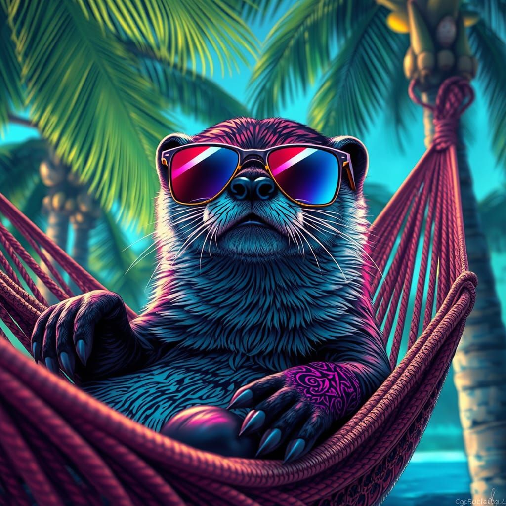 A vibrant tattoo of an otter in sunglasses lounging in a hammock. The image blends futuristic realism and psychedelic patterns with hyperrealistic details and a bioluminescent glow.
