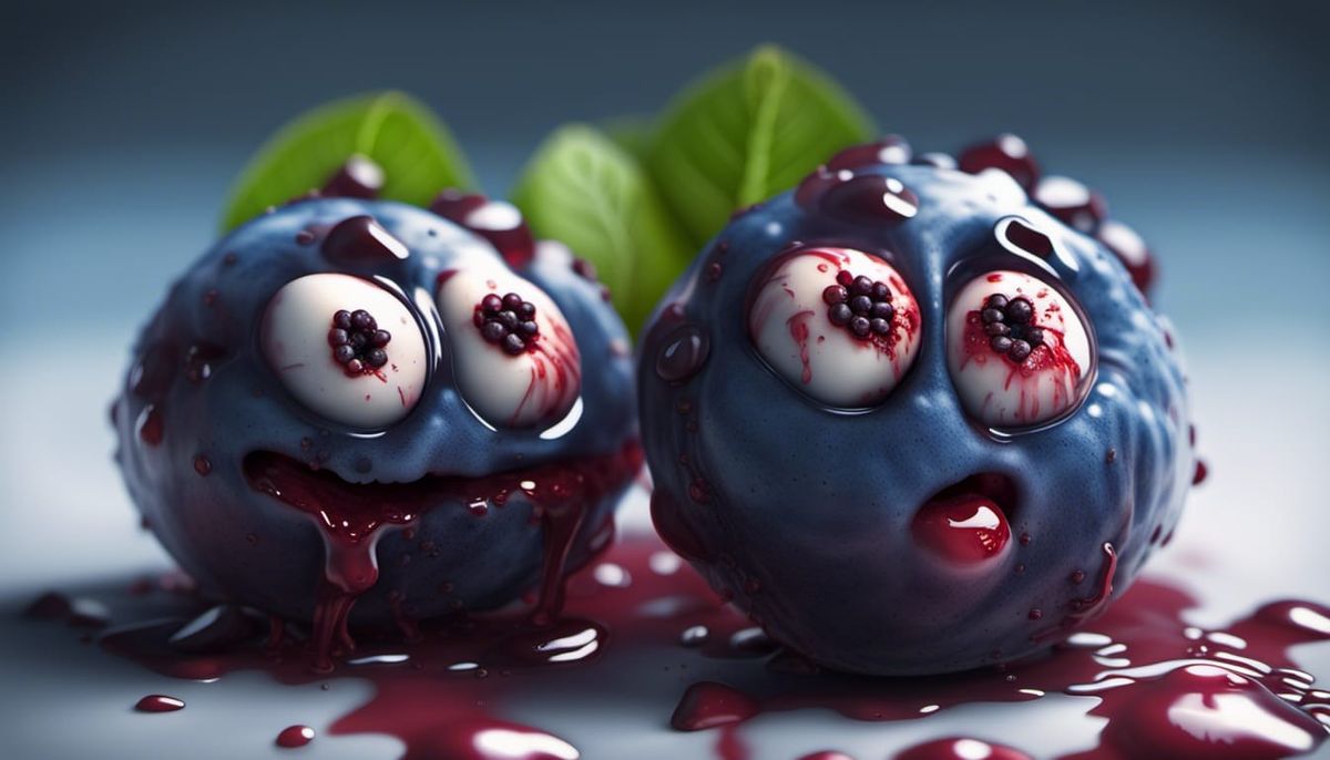 A photorealistic animation of anthropomorphic blueberries engaged in cannibalism, splattering juice. This image features intricate details, deep colors, and a blend of horror and comedy elements, reminiscent of fantasy concept art.