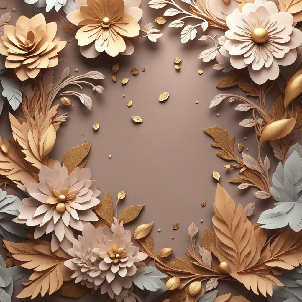 This image shows a 3D papercut design featuring flowers and leaves. The color palette is soft earth tones, accented with glitter gold, rendered as detailed 3D digital art.