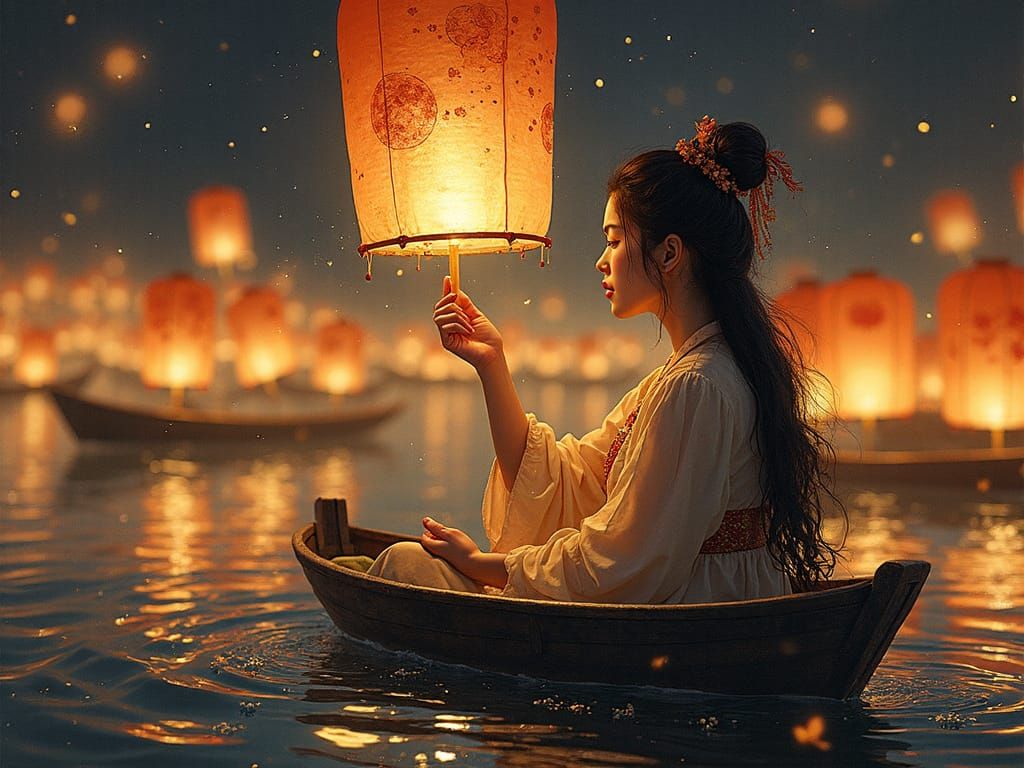 This stunning image shows a serene Chinese woman surrounded by celestial elements, with the moon, sun, and stars shining in her eyes. She's adorned with gold stars on her lips and holds a lantern, set against a night sky filled with glowing lanterns.