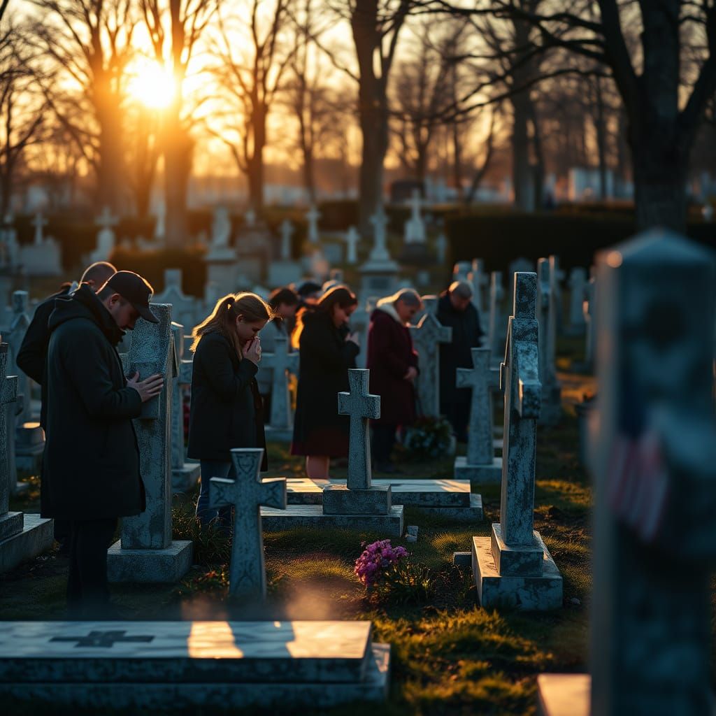 This image shows a hyperrealistic photograph of a German Christian cemetery on All Souls' Day. Visitors pray at graves with detailed physiognomy, bathed in warm, low sunlight and gentle mist.