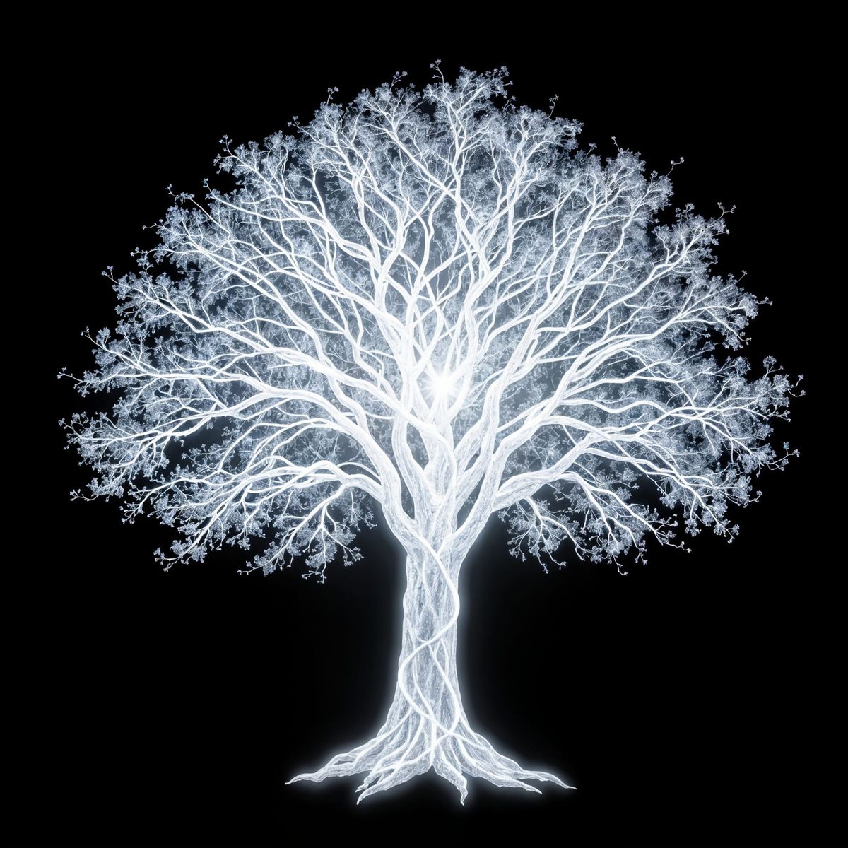 This image shows a luminous white tree constructed from pure silver light. The high contrast and shiny textures create a striking, ethereal effect.