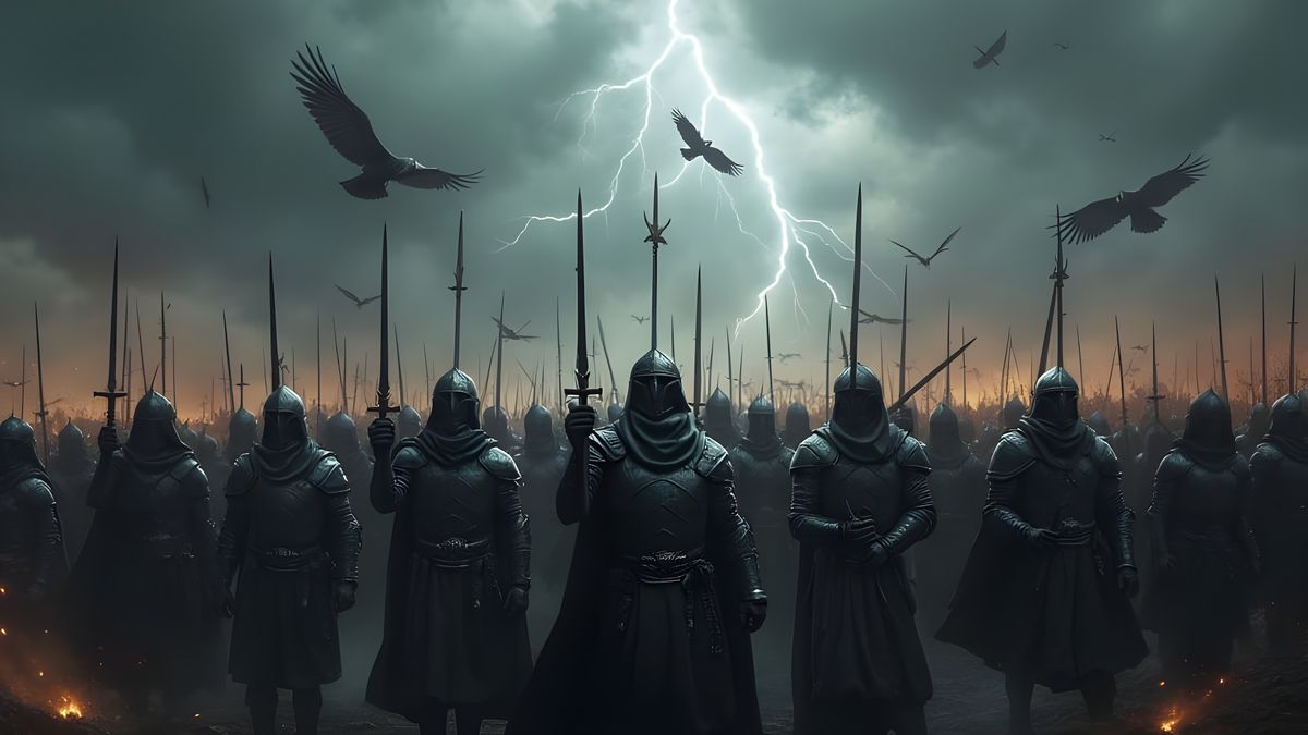 This image shows black armor-clad warriors on a battlefield under a stormy sky, their swords raised. Runes glow above them as ravens circle in a dark fantasy scene with dramatic lighting.