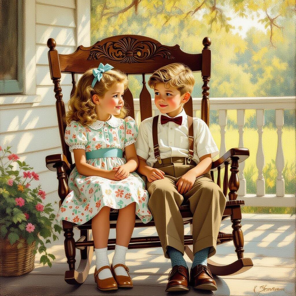 This image shows two well-dressed children sitting in a rocking chair on a porch. The scene is bathed in golden light, with a rustic, painterly aesthetic.