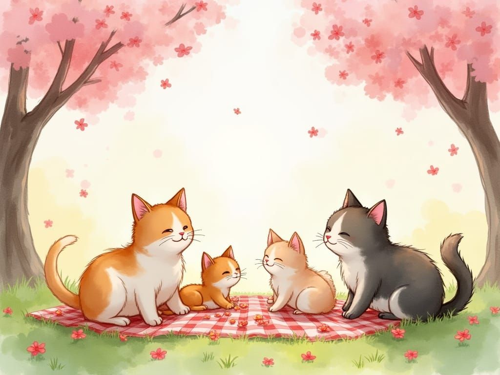 A charming storybook illustration of an anthropomorphic cat family enjoying a picnic amidst blooming cherry blossoms. The painting features soft pastel colors and gentle brush strokes.