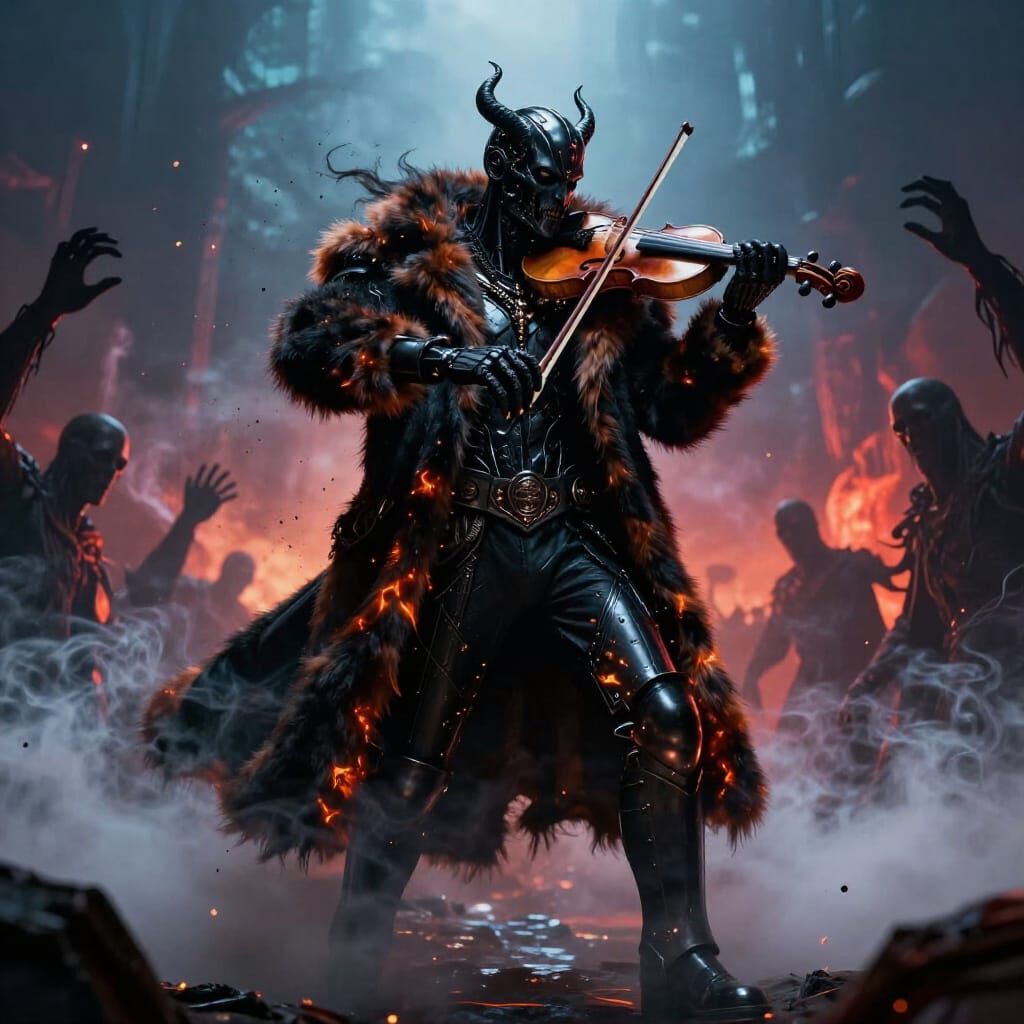 A hyperrealistic image of a sleek, dark robot-demon warrior in ornate armor, playing a violin amidst a chaotic battle. Features cinematic lighting and ash particles.