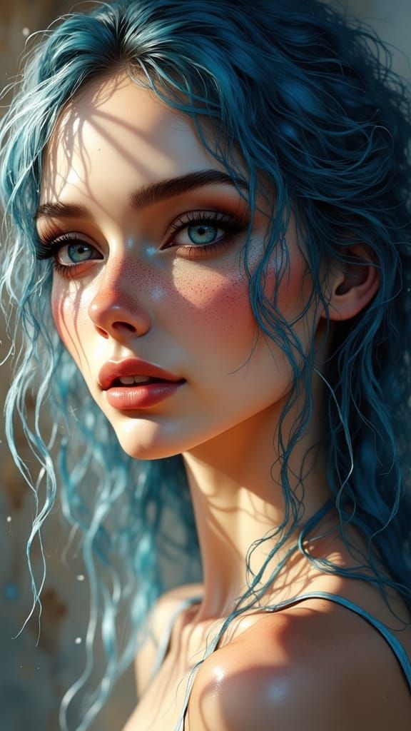 This image shows a European woman with blue hair, freckles, and blue eyes. Cinematic lighting highlights her thoughtful expression and detailed skin texture.