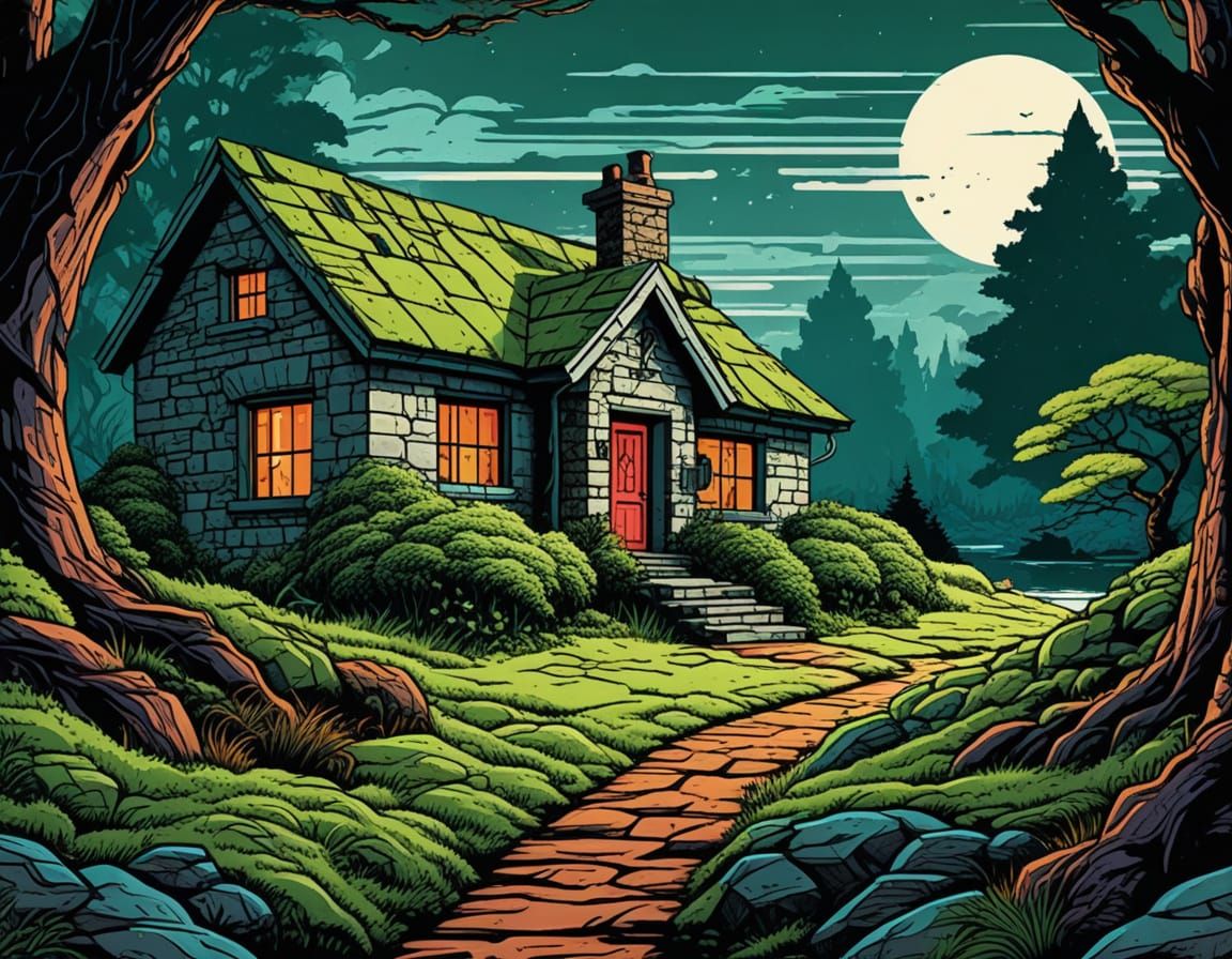 This vibrant comic book illustration depicts a moss-covered stone cottage in a dynamic, retro-futuristic style, characterized by bold lines and bright colors, reminiscent of classic comic book art.