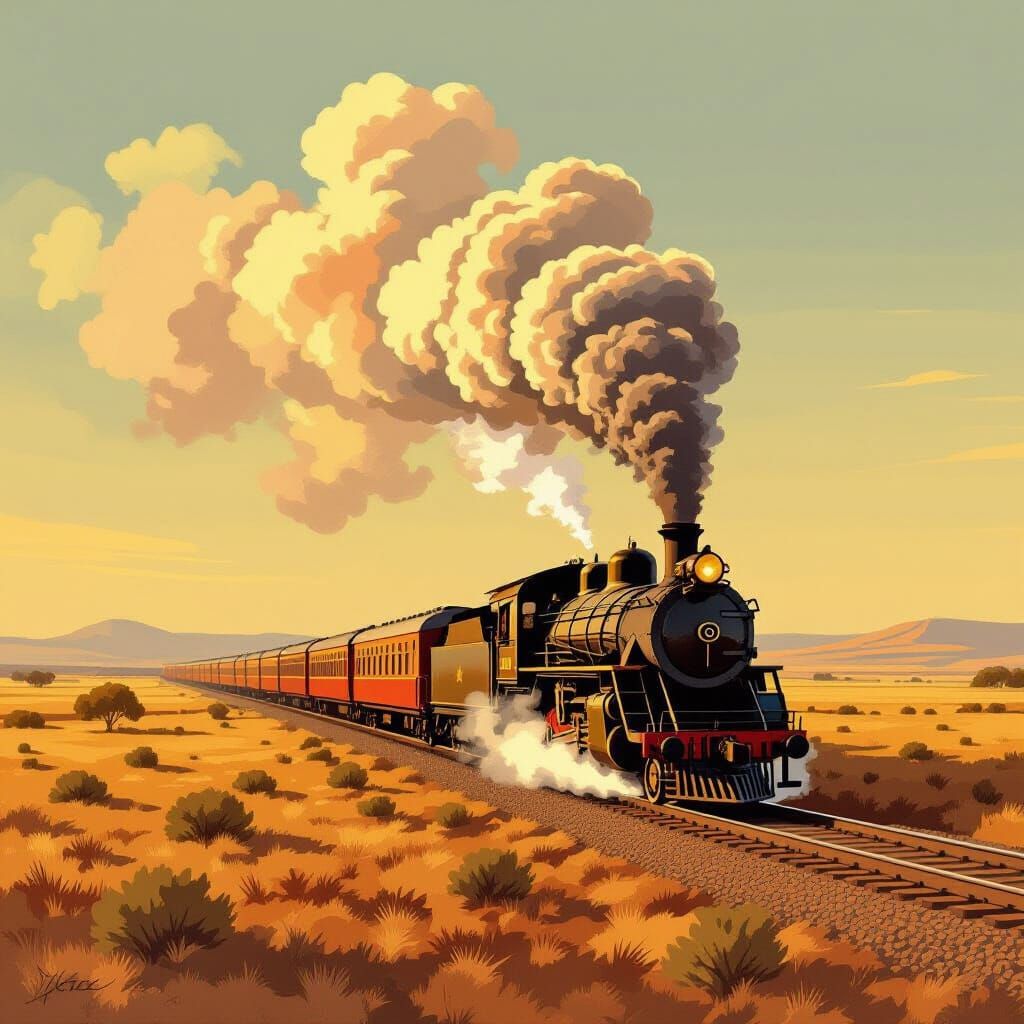 This image depicts a vintage steam train traversing the dry South African veldt during golden hour. The scene evokes nostalgia with its warm, desaturated earth tones and atmospheric perspective, inspired by vintage travel posters.