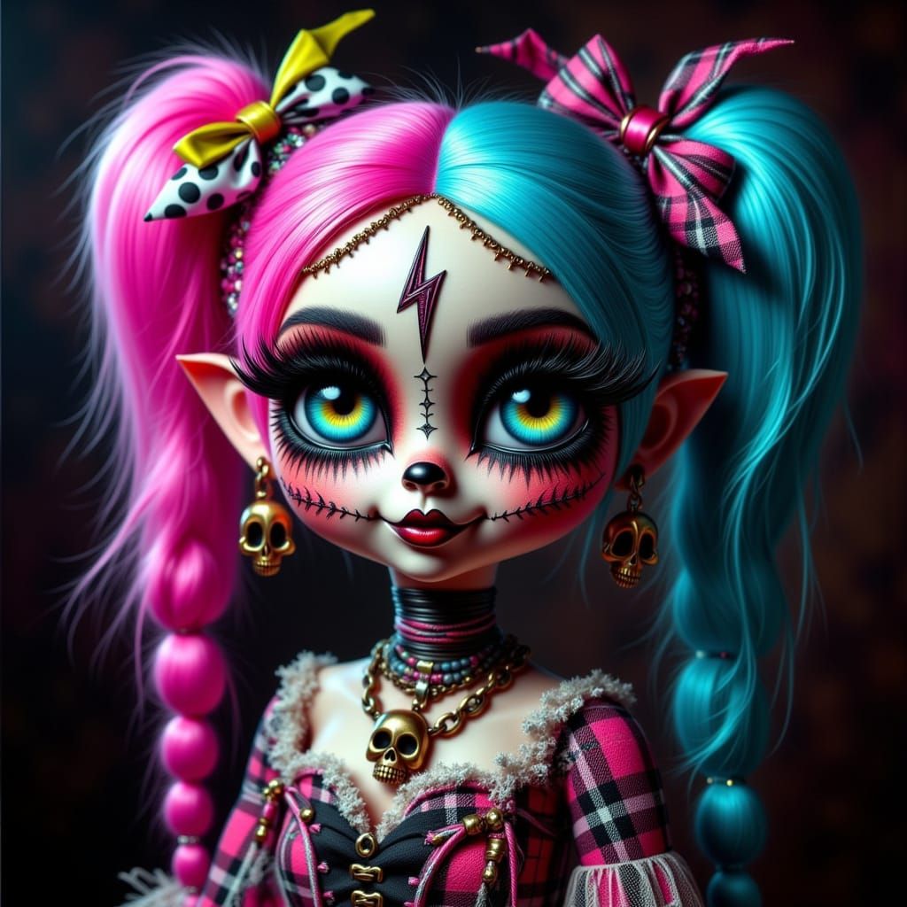 This image features a whimsical gothic voodoo doll with vibrant pink and blue hair, bohemian accessories, and large iridescent eyes. It wears a medieval gothic outfit and is set against a dark, macabre background with moody lighting.